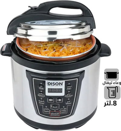 قدر ضغط كهربائي إديسون، وعاء داخلي تيفال، 1300 واط، 8 لتر، 8 وظائف طبخ، VT-802D - فضي اسود