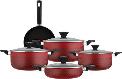 طقم قدور تيفال رد فلام، 9 قطع، غطاء زجاج - أحمر أسود