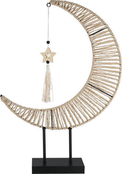 ستاند ديكور رمضاني ستانلس استيل، 43x10x59 سم، شكل هلال من الخوص، قاعدة بإضاءة- أسود بيج