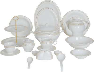 طقم تقديم سفرة بورسلان السيف غاليري، 65 قطعة، نقش ذهبي - أبيض بيج