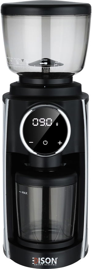 Edison CG201 Digital Coffee Grinder, 180W, 210g, Built-in Scale, Touch Control, Single Speed, 30 Grind Settings - Black