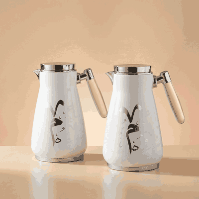 Al Saif Gallery Engraved Thermos Set, 0.75/1 Liter, 2 Pieces, Glass Inner Container, Stainless Steel Outer Body, Push Button, Transparent Handle - Pearl White Silver