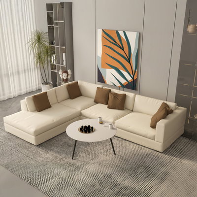 Modern L-shaped Swedish wood sofa, 270 x 210 cm, velvet fabric - beige