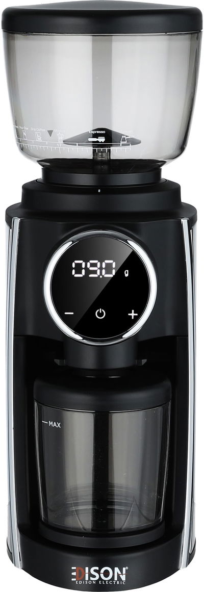 Edison CG201 Digital Coffee Grinder, 180W, 210g, Built-in Scale, Touch Control, Single Speed, 30 Grind Settings - Black